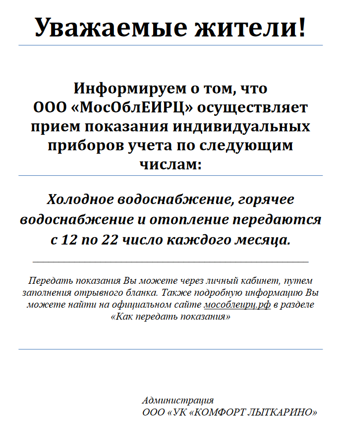 Передача показаний в МосОблЕИРЦ для жителей 6-мкр д. 32, 33